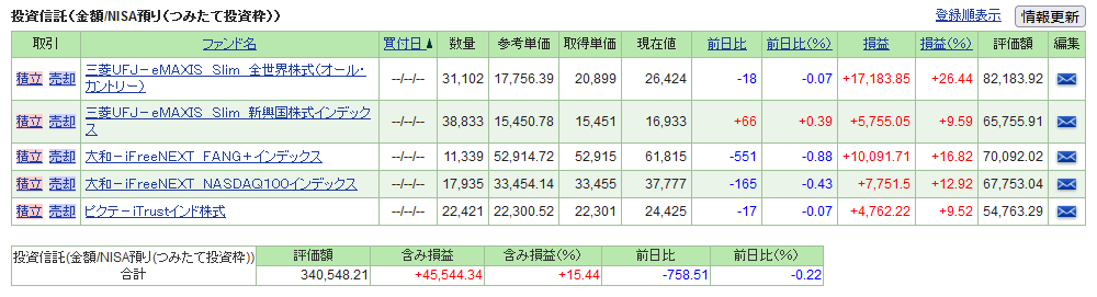 相変わらず投資信託はコンスタントに利益を出し続けてくれています。もはや我が家では、すぐに使わないお金を置いておく準銀行口座的な扱いだったりして。多少の暴落は覚悟してるけど、恐慌レベルはマジ勘弁な!