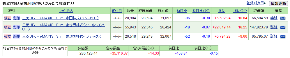 | 三菱UFJ-eMAXIS Slim 全世界株式(オール・カントリー) | 125,000 | 22,819.14 | 18.25 | 147,823.78 |