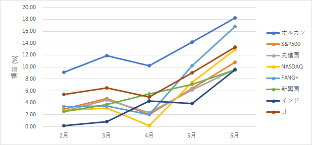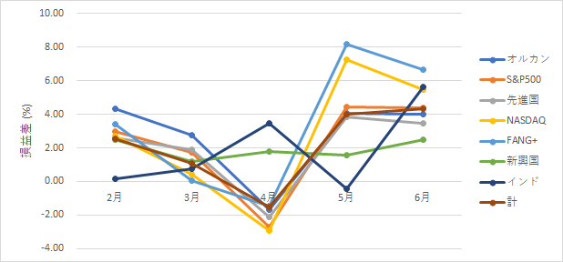 今月はすべての銘柄で好調。今までだいたいオルカンが好調だとインド株式が低成長orマイナスだったんだけど、そろって好調。オルカンとインド逆なんじゃないの説はあえなく潰えました。インドはそこまで天邪鬼ではなかったみたい。まあ、好調だったから良いんだけどー。