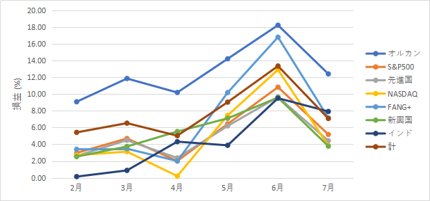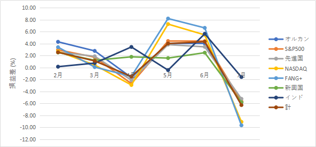 オルカンとインド逆なんじゃないの説に続いて、新興国安定説も終了。損益(%)グラフを見ると「へ」の鏡文字みたいに落ち込んでます。損益差(%)に至っては崖。残念ながら投資の世界に安定なんてもんはそうそうないっぽいですな。……当たり前か。