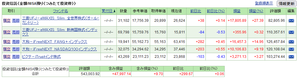 | 大和-iFreeNEXT FANG+インデックス | 110,000 | 16,457.30 | 14.96 | 126,457.84 |