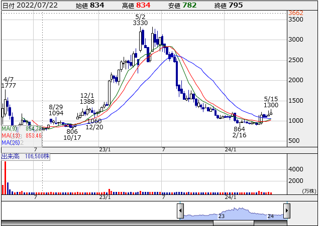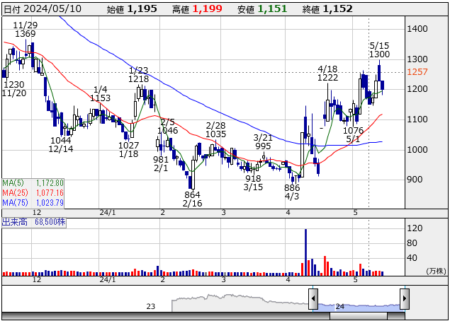 株探から拝借したチャートを見てみると、すでに日足は上からMA(5)、MA(25)、MA(75)とキレイに並んでいます。なのでこのまま上がり続けて、23年1月のように上昇して、最高値に迫るんじゃないかなー、ってのが僕の予想。……まあ僕の予想は当たらないんですけど。