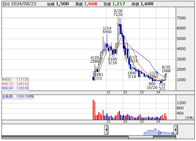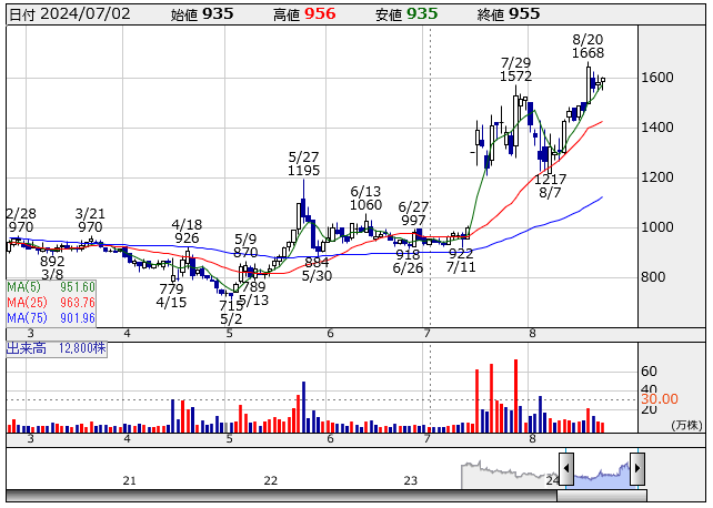 と、ここまで先月の引用。前回スクリーニングした7月29日時点で1,530円、その後ちょっと下がった後は上がり続けて、8月23日時点で1,600円。その間特に大きなイベントはないっぽいけど着実に株価上昇。