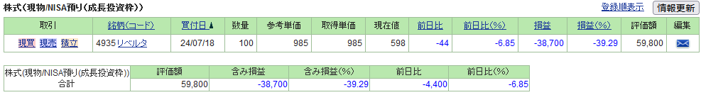 現在スタメンはちょっとだけ勝ってる。700円プラスなんだからまずはこれをとっとと売って、とりあえず1勝しましたってことに……、などと考えずに、ここから伸びることを期待します! まあ、リベルタの損失に比べれば、スタメンのプラスなんて消費税にもなってないんだけどね。