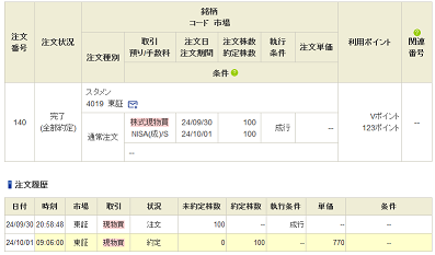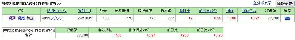 新たに購入したのは9月のスクリーニングで注目したスタメン(4019)です。もちろん指値とか難しいテクニックには手を出さず成り行き注文。