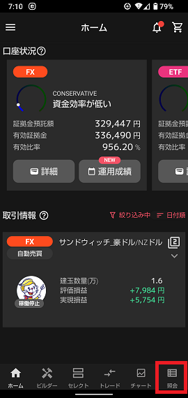 以上で「サンドウィッチ_豪ドル/NZドル」は全決済されました。確認画面に書いてある通り、いちいち事前に稼働停止しなくても「一括決済」すれば自動売買は停止します。副次効果として評価損益8000円弱ゲットだぜ!