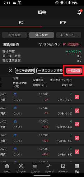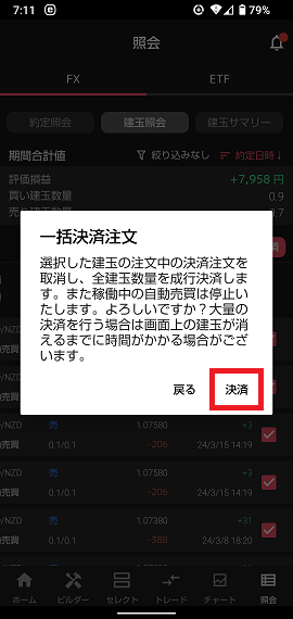まずはホーム画面右下の「照会」を選択。照会画面右側真ん中ら辺の「一括決済」を押すと、画面のように全選択状態になるので、ここで再び「一括決済」。確認画面が出てきたら内容を確認して「決済」です。まあトライオートFXはマニュアルがしっかりしてるんで説明するまでもないんですけどね。