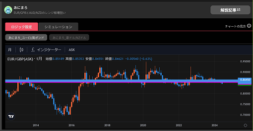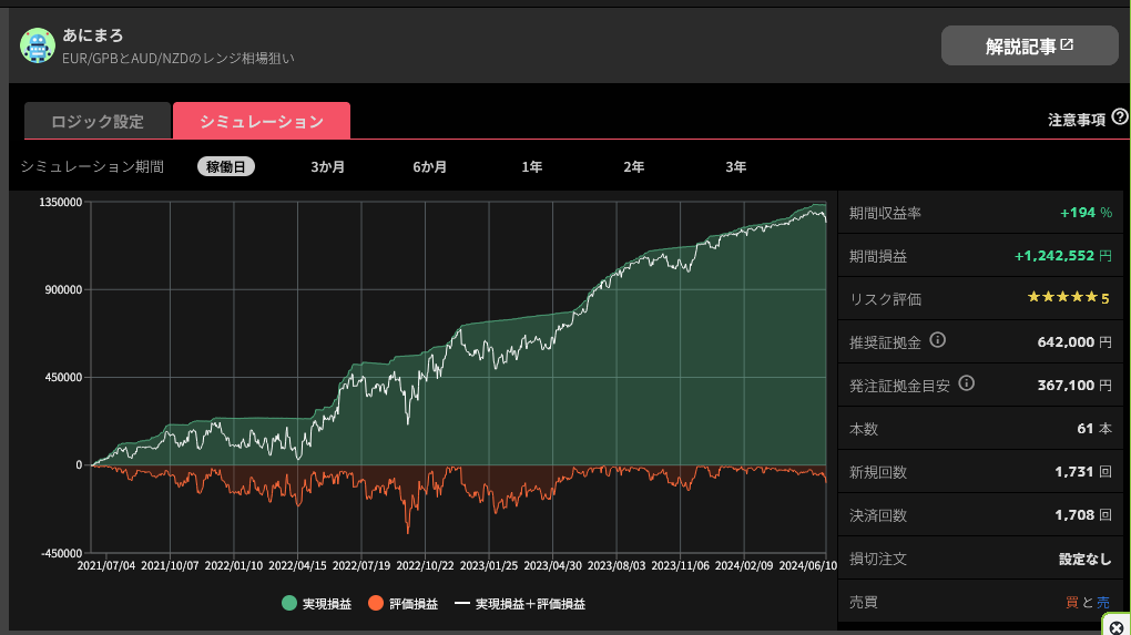 なんですけど長期チャートを見ると、「あにまろ」はかなり薄氷を踏む設定だったことがわかります。ここ十年でレンジ内におさまっている期間よりも、レンジアウトのほうがずっと長い。それなのに「あにまろ」は2021年の稼働から着実に利益を重ねています。これってすごくね?