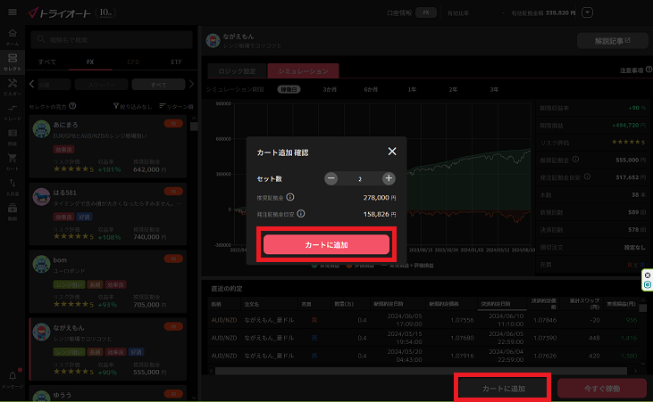 選んだのはシェア「ながえもん」。レンジ相場のAUDNZDでコツコツ稼ぐタイプで、短期はもちろん、長期でもほとんどの値動きがレンジ内におさまっていて安心。……ただし安心と利益はトレードオフであって、シミュレーション結果は控えめ。まあ大ダメージ直後だし、これくらいがちょうど良い?