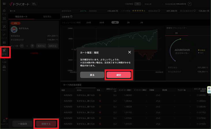 画面右下の「カートに追加」ボタンを押し、出てきたウィンドウでセット数を調整、「カートに追加」しました。さらにカートの中を覗いて設定を確認したら「稼働する」⇒出てきたウィンドウで「確定」。
