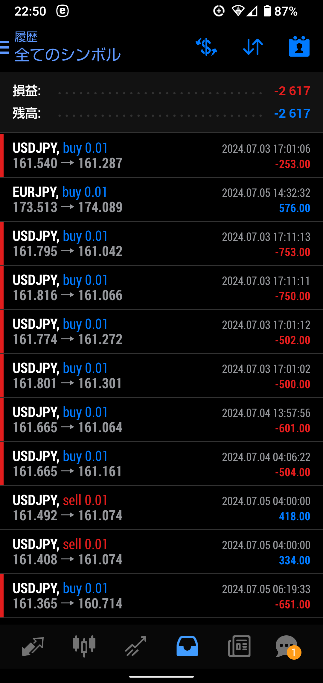 | 損益(円) | 0 | -4,816 | -2,100 | 3,337 | -2,617 |