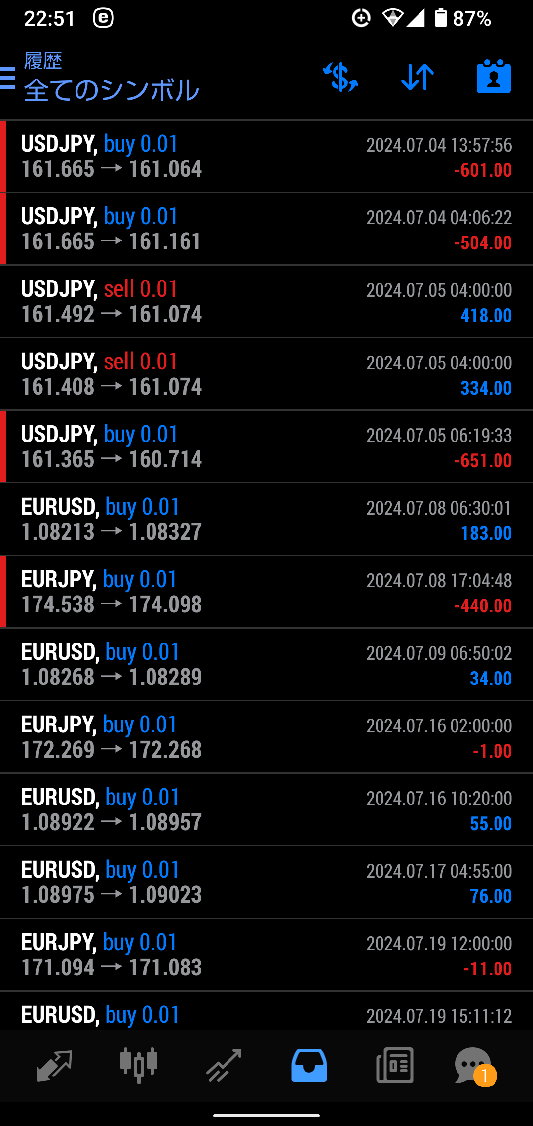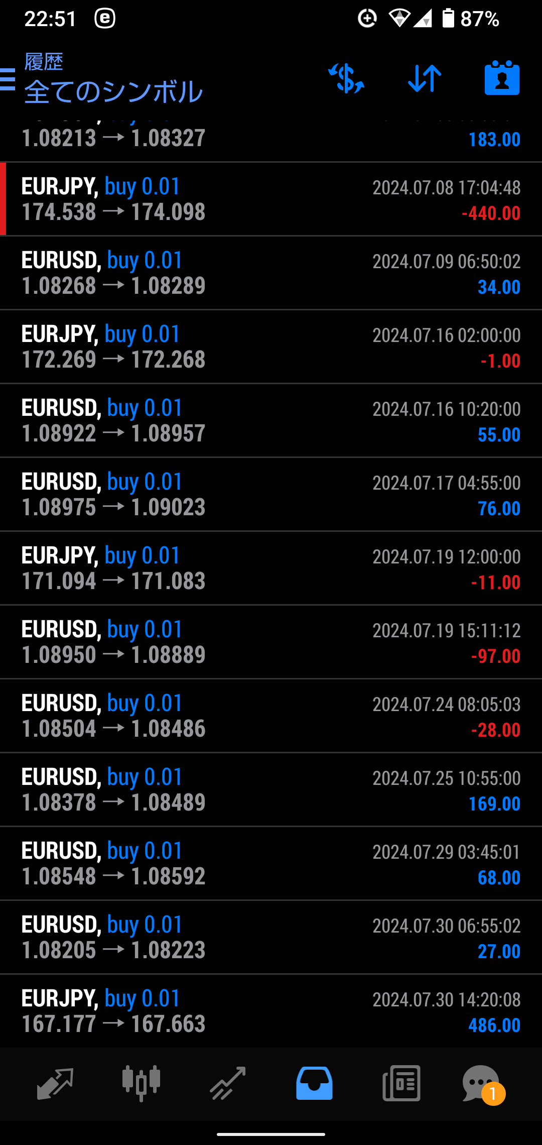 MT4によるFX自動売買は、再びマイナスへと大きく傾いてしまいました。これは6月の円安傾向と7月の円高傾向で、相性の良いEAが変わったからじゃね? って思ってます。