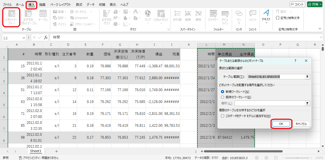 具体的にいうと画像14みたいに1日に複数回取引がある場合、損益を合算したい。そんなときにはピボットテーブルが良さげ。「挿入」⇒「ピボットテーブル」で「テーブル範囲」を選んで「OK」を押します(画像15)。あとは項目をドラッグ&ドロップすれば良いのですよ(画像16)。
