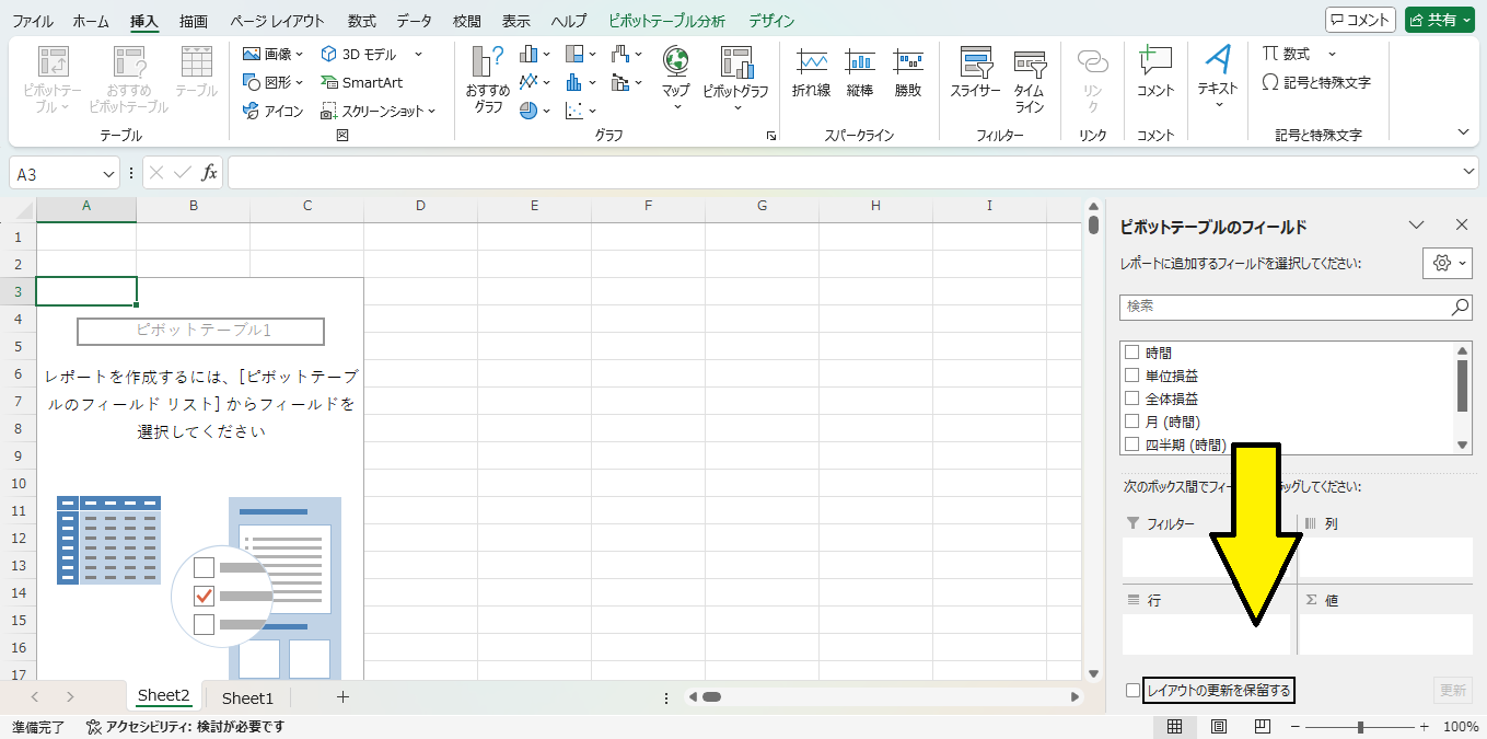 まずは「時間」を「行」にドラッグ&ドロップ。すると「年(時間)」とか余計なものも「行」に追加されます(画像17)。今回これはいらないのでチェックを外して削除(画像18)。「列」には「単位損益」と「全体損益」を追加すれば、それっぽい表が作成されます(画像19)。