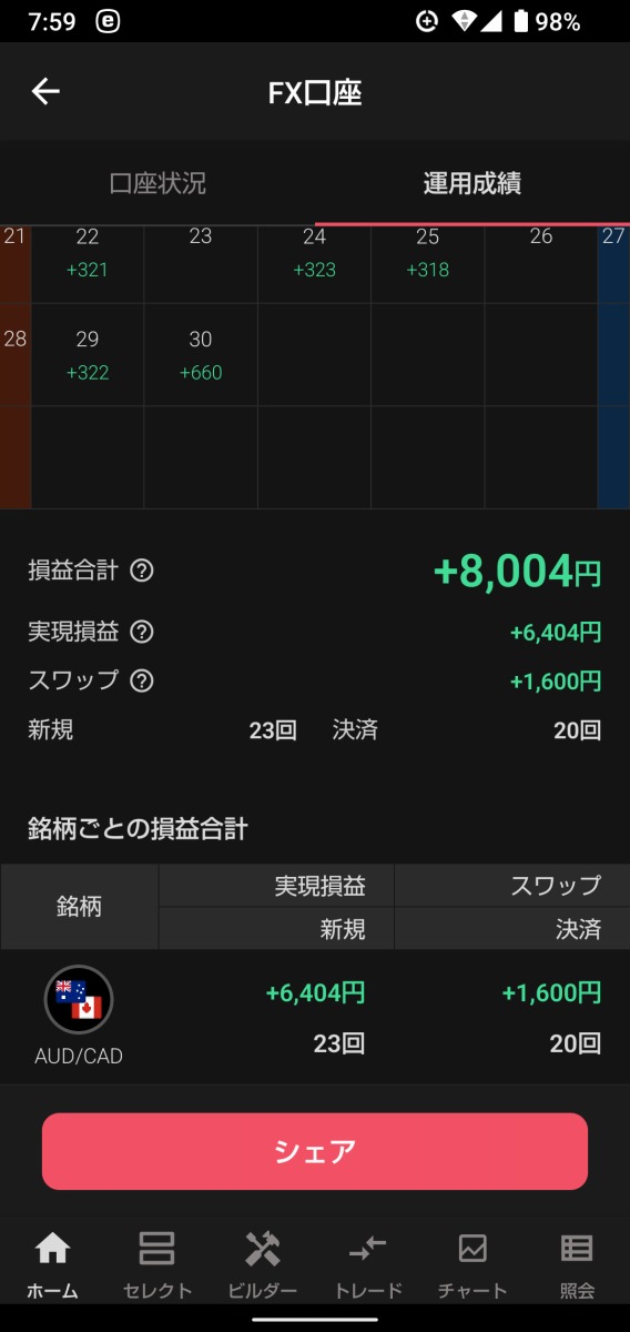 ビルダーで自作したシェア「利を見てせざるは勇無きなりAUD/CAD」は8月の月利0.5%から2%まで調子を上げた。