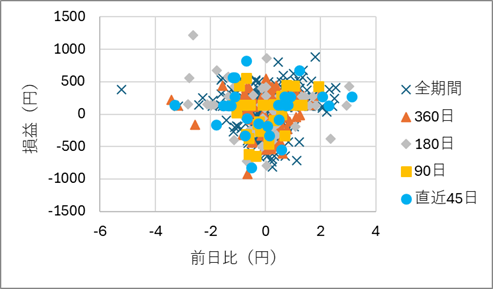 まずは基本から。単純なUSD/JPY前日比を横軸に、損益(円)を縦軸に取ってプロットです。