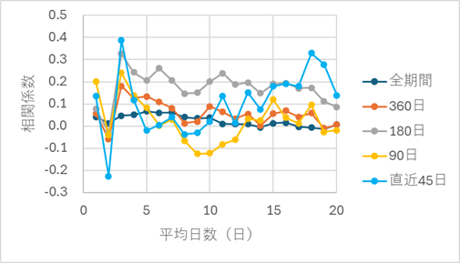 2日平均はマイナス相関で、3日平均はプラス相関っぽいけど、全体的に言って強い相関はないみたいです。直近45日で平均日数15日以上、あるいは180日で3日以上だとちょいプラス相関かも。もう少し個別に見る必要がありますな。