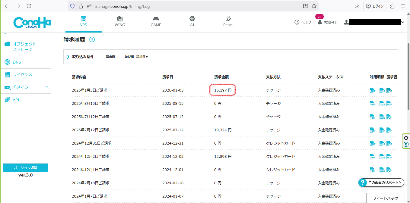 まずは2026年幸先の良いスタート。今年はここから大幅に頑張っていただきたい。そんな頑張りをサポートする意味でも固定費削減が必要だよね。ということで後述の通り、サーバーをConoHaに変更して節約に成功。