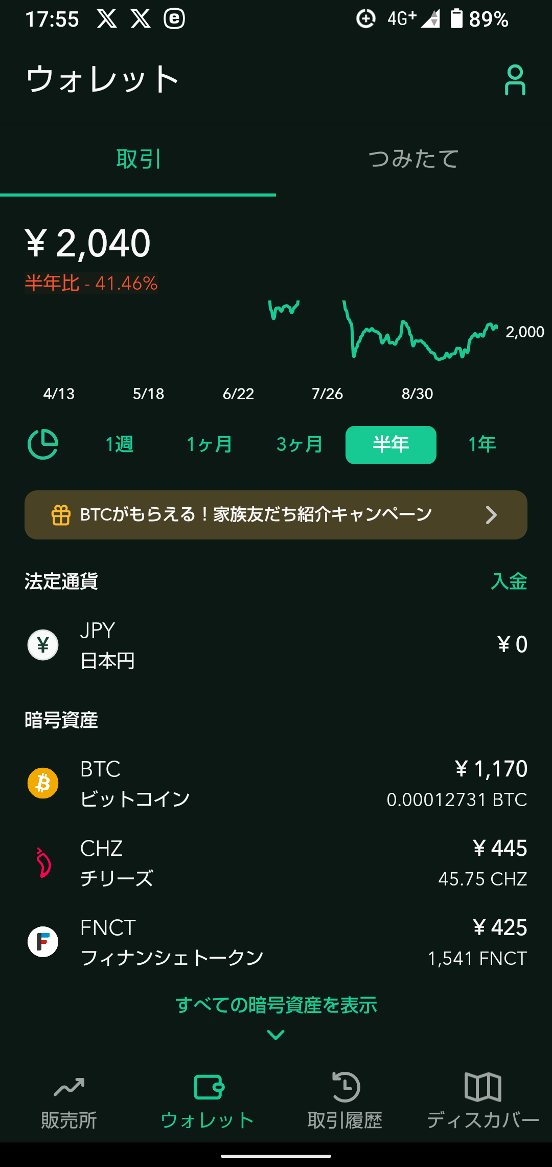 これは来る! と思って買ったFiNANCiEのCT、暗号通貨FNCTとCHZは大損だけど、タダでもらった暗号通貨BTCとWLDの威力は大きい。このあたりはすっかり忘れて放っておいて良いと思う。もともと無料だったんだしー。