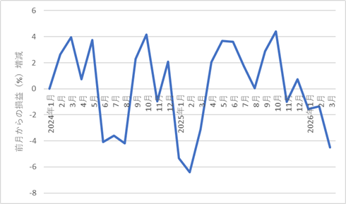 | 前月からの 損益(%)増減 | -8.68 | 0.81 | 3.46 | 2.55 | -2.92 | -4.51 |